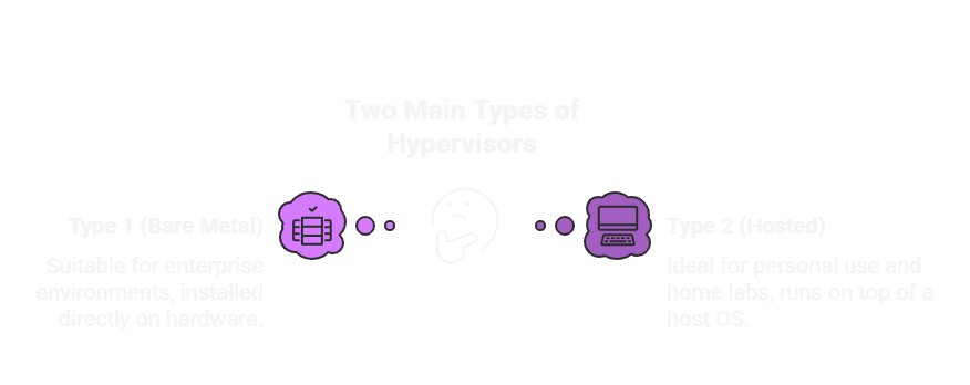 Type 2 (Hosted): Runs on top of a host operating system (e.g., VMware Workstation Pro, VirtualBox). Ideal for personal use and home labs.