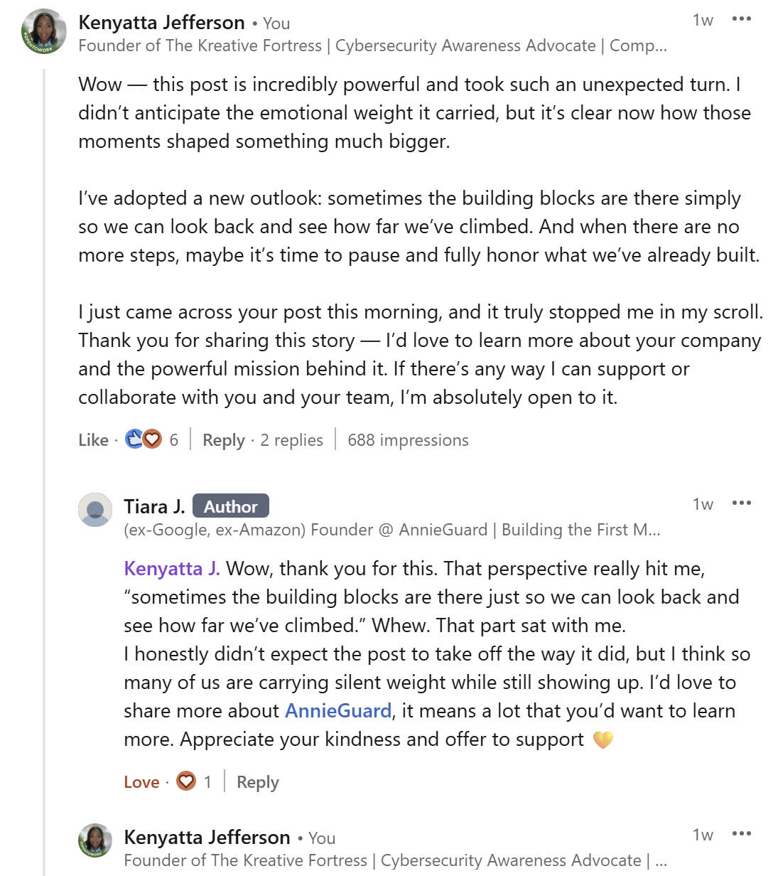 Her story was raw and real, sharing how pain and personal loss shaped her mission to protect and empower others. So, I also allowed myself to be vulnerable and commented instinctively. I just needed her to know that her message was exactly what I needed to hear at this point in my own journey, and how thankful I was for her for sharing.